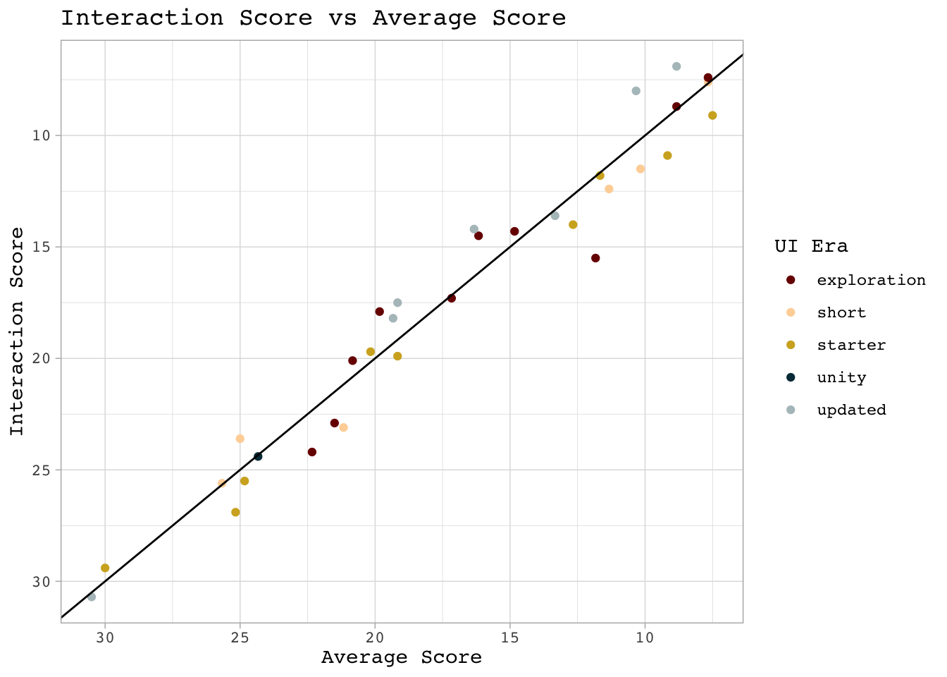 The Updated UI once again scores better in this category compared to its overall scoring average. Notably, the Starter, or original, UI (games 1-9) seems to score worse in this category. Let’s look at another scatterplot to get a better sense of this comparison: