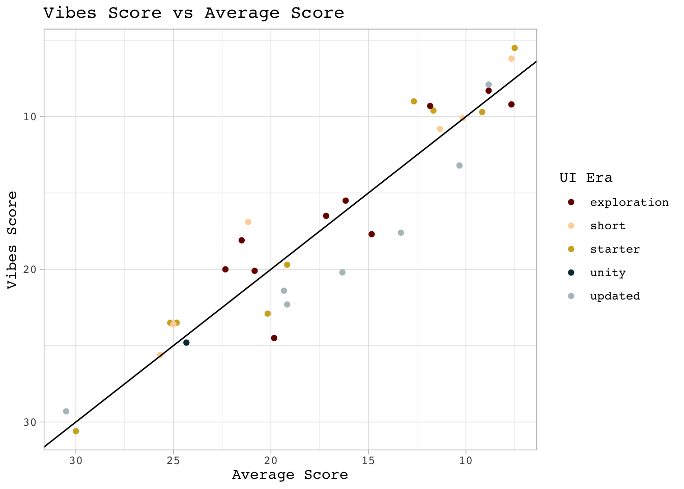 So, we see that while games from the Exploration era (games 16-25) rank the best in overall scores, the Short era (games 10-15) rank considerably better based on vibes.