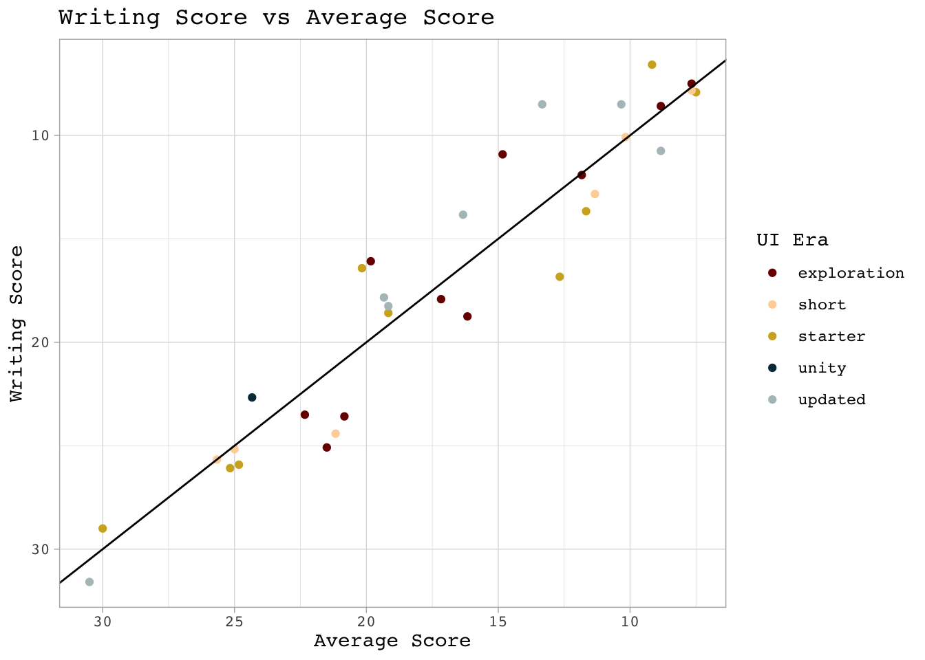 This time, the newer games from the Updated UI era ranked better on average based on their writing in comparison to their overall scores. Let’s look at a scatterplot of this data: